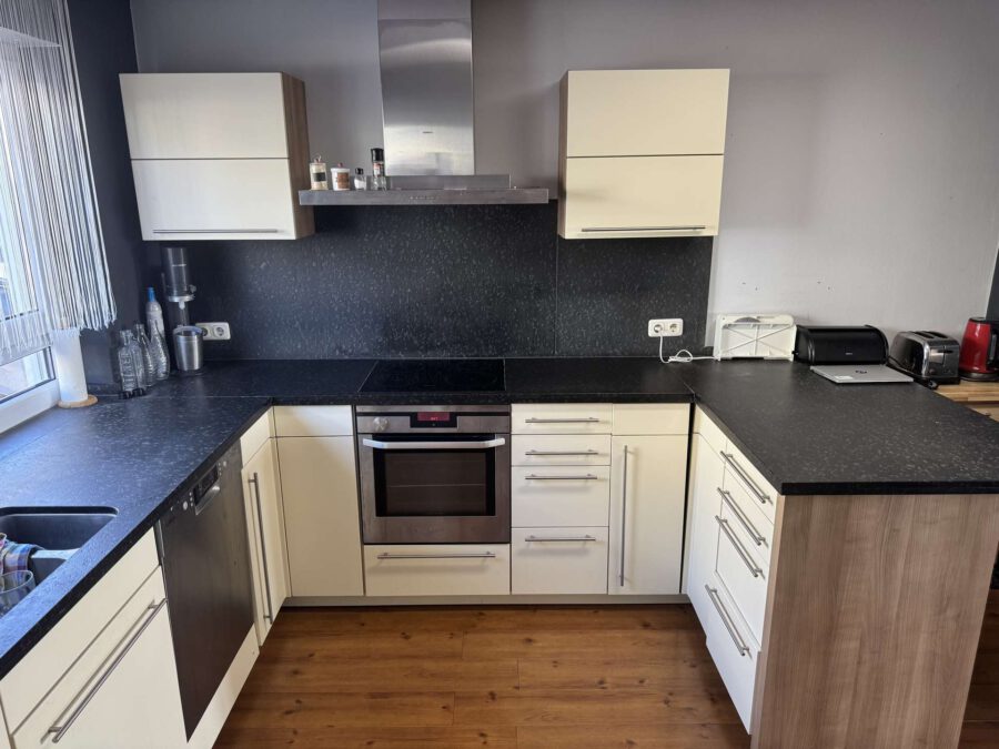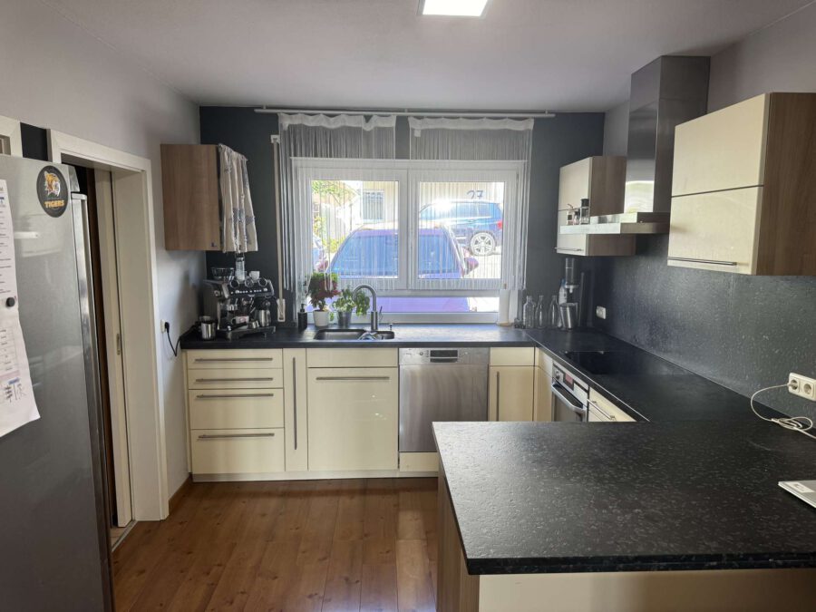 Bereits beim Betreten des Hauses empfängt Sie ein freundlich gefliester Eingangsbereich mit ausreichend Platz für Garderobe und Schuhschrank. Von hier aus gelangen Sie sowohl direkt in den offenen Wohn-Essbereich als auch in die großzügige Küche, die mit hochwertigen Geräten (u. a. von Neff und Bosch), einer Granitarbeitsplatte, einem separatem Abstellraum sowie einer Theke ausgestattet ist. Eine praktische Holzschiebetür trennt die Küche dezent vom Flur ab.