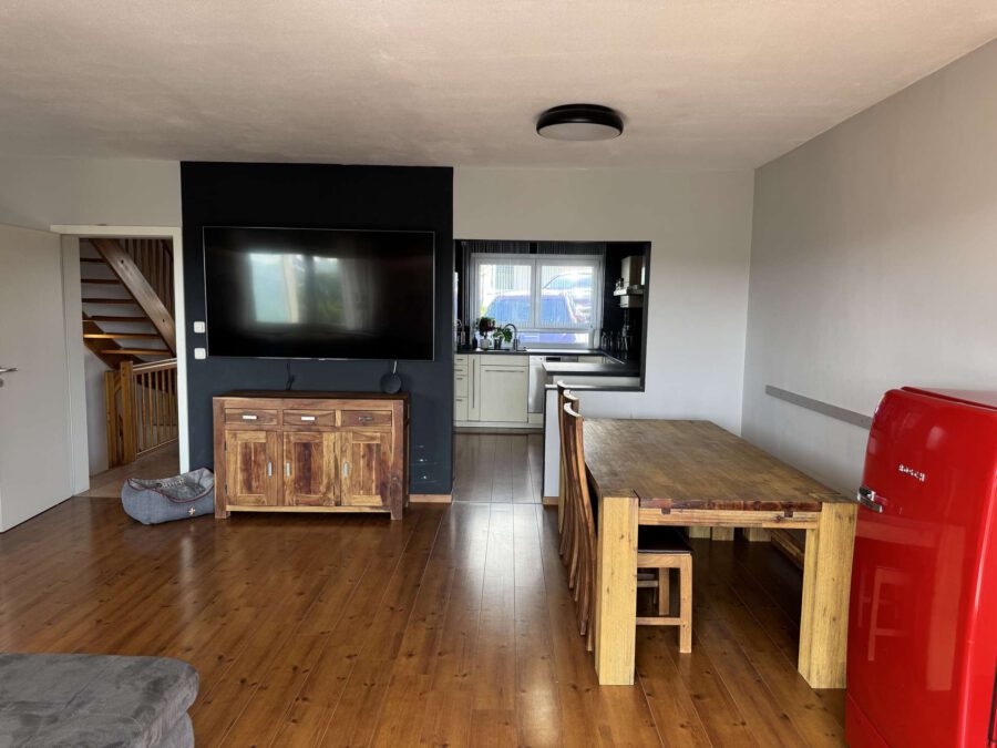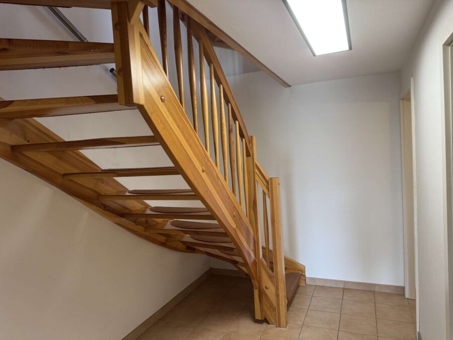 Eine offene Holztreppe mit massiven Kieferstufen verbindet die drei Wohnetagen. Im Gartengeschoss – welches aufgrund der Hanglage direkt vom Garten begehbar ist – befinden sich zwei weitere Wohnräume, jeweils mit bodentiefen Fenstern und direktem Zugang auf die große Terrasse und in den Garten. Ergänzt wird diese Ebene durch ein Duschbad mit WC sowie eine praktische Waschküche mit Heiztechnik.