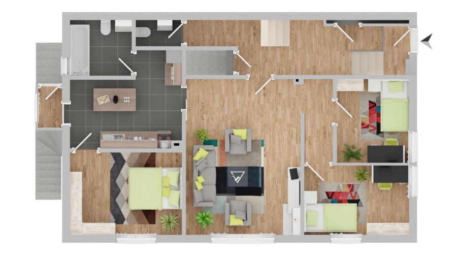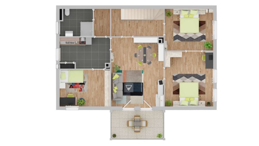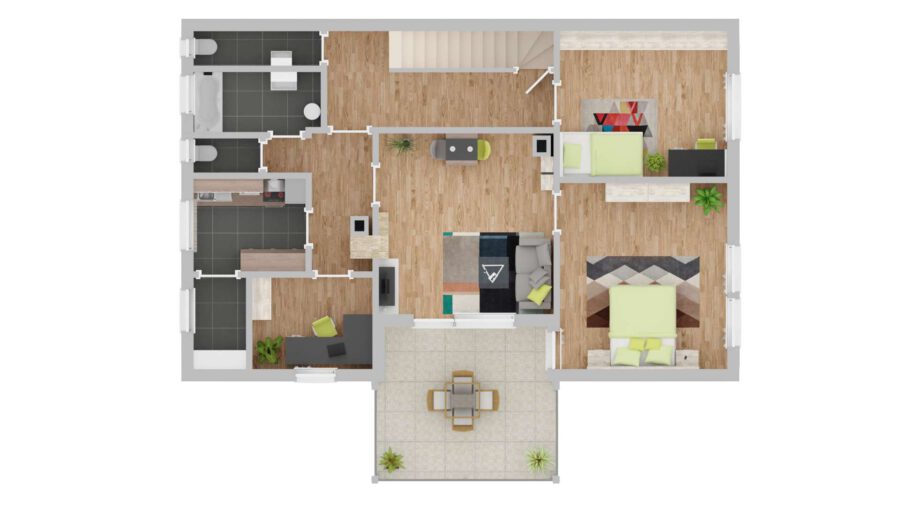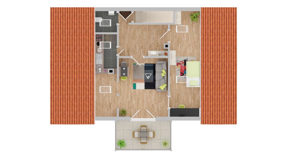 Das Dachgeschoss hat ca. 60 qm und zwei Schlafzimmer, einen offenen Wohn-Essbereich und ein Badezimmer sowie Zugang auf den Balkon.