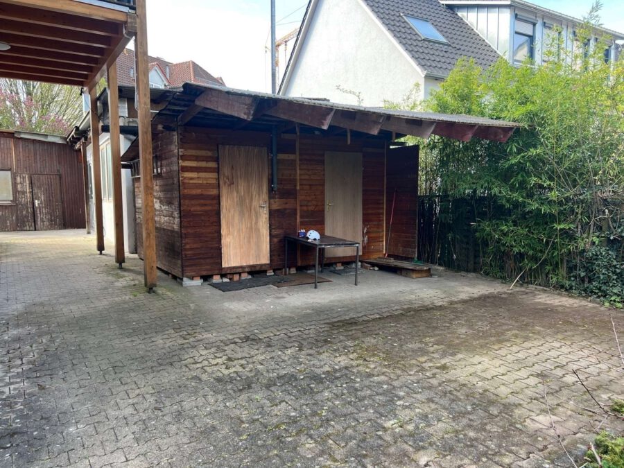 Der Zugang zum Gebäude erfolgt von der Untertürkheimer Straße aus. Vor dem Gebäude ist ausreichend Platz für drei PKW. Der Werkstattbereich bietet zusätzlich die Möglichkeit für Garagen.
