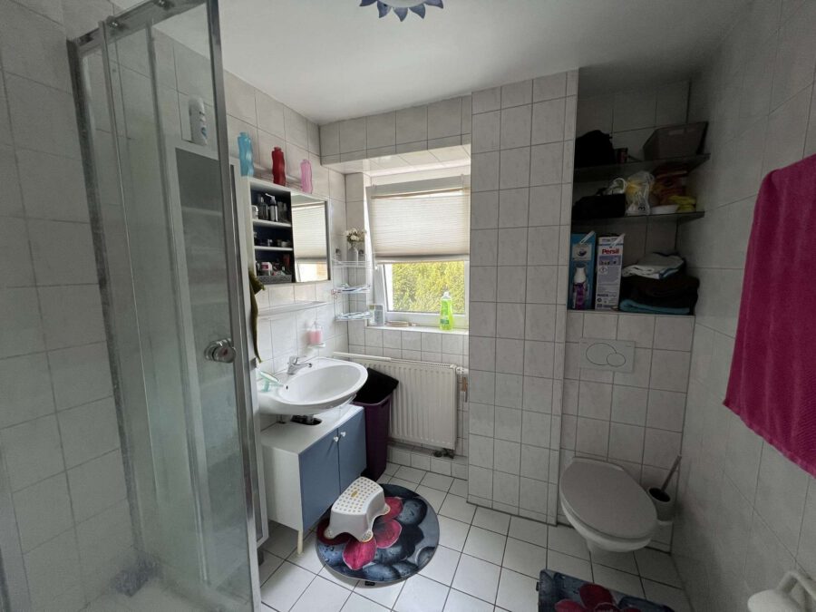 Die Erdgeschosseinheit befindet sich im Hochparterre, wird über drei Stufen erschlossen und verfügt über ca. 90 qm Wohnfläche. Direkt am Eingang befindet sich ein geschickt angelegter Abstellraum / Garderobe.