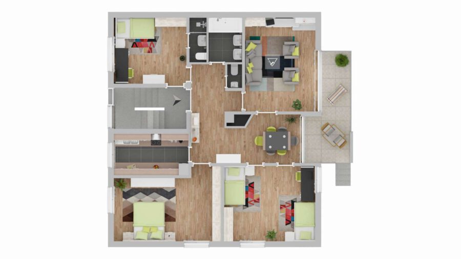 Die Wohnungen im Erd- und Obergeschoss verfügen jeweils über großzügige und lichtdurchflutete Grundrisse mit ca. 104,5 m² Wohnfläche. Es sind zwei großzügige Schlafzimmer, ein Wohnzimmer mit vielen Fenstern sowie ein Essplatz mit Ausgang zum Balkon vorhanden. Das große Kinderzimmer ist mit zwei Türen ausgestattet, so dass auch eine Raumteilung für ein weiteres Kinderzimmer möglich wäre. Über den zentral angelegten Flur wird das separate WC sowie das Badezimmer mit Doppelwaschtisch und Badewanne erschlossen. Beide Wohnungen verfügen über ein zusätzliches Zimmer mit ca. 14 qm, das sogenannte Jugendzimmer, inkl. eigenem Bad. Im Erdgeschoss wird dieser Bereich über den internen Flur erschlossen, im Obergeschoss direkt aus dem Treppenhaus. Die Installation einer separaten Küche für ein zukünftiges Einzimmerappartement wäre auf beiden Etagen möglich.