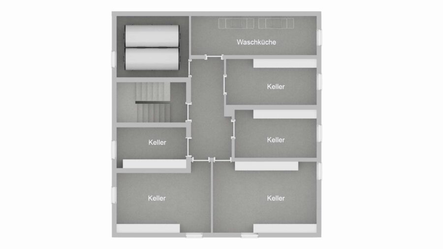 Das Gebäude ist vollständig unterkellert und bietet neben einem gemeinsamen Waschraum zahlreiche Abstellräume für die Bewohner.