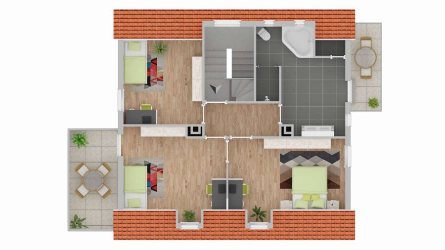Über eine interne Holztreppe führt der Weg in die zweite Ebene der Wohnung im Dachgeschoss. Hier befinden sich drei großzügige Schlafzimmer, ein Wellnessbad mit Doppelwaschtisch, Eckbadewanne, WC und Dusche sowie zwei Balkone.