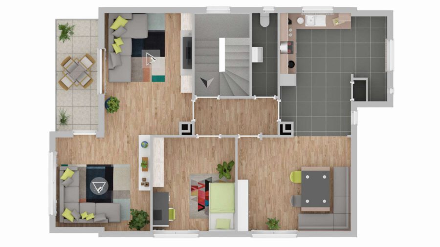 Zentrales Element ist die offene Wohnküche mit separater Essecke und Abstellraum. Auf dieser Ebene sind des Weiteren ein Büro / Gäste-Zimmer sowie der zweigeteilte Wohnbereich mit Zugang zum Balkon. Ein Gäste-WC ist über den Flur zugänglich.