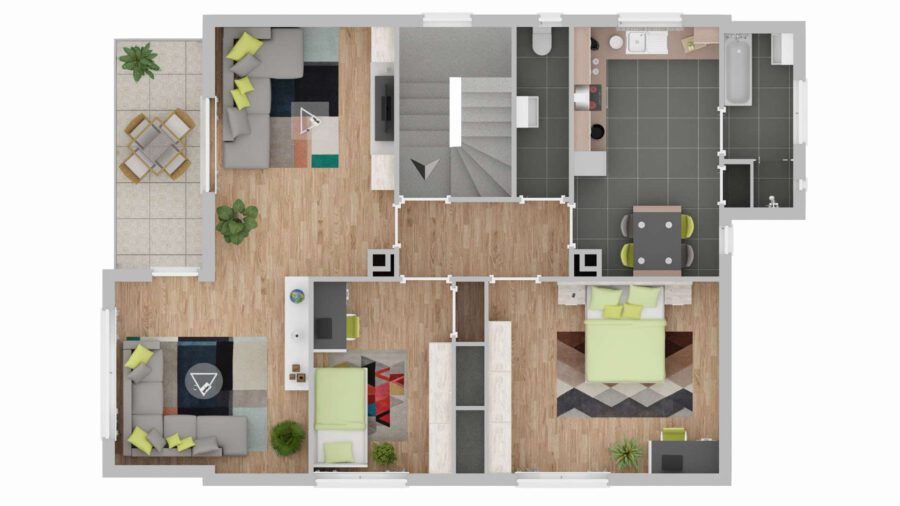Die Maisonette im Ober- und Dachgeschoss bildet das Herzstück des Hauses.