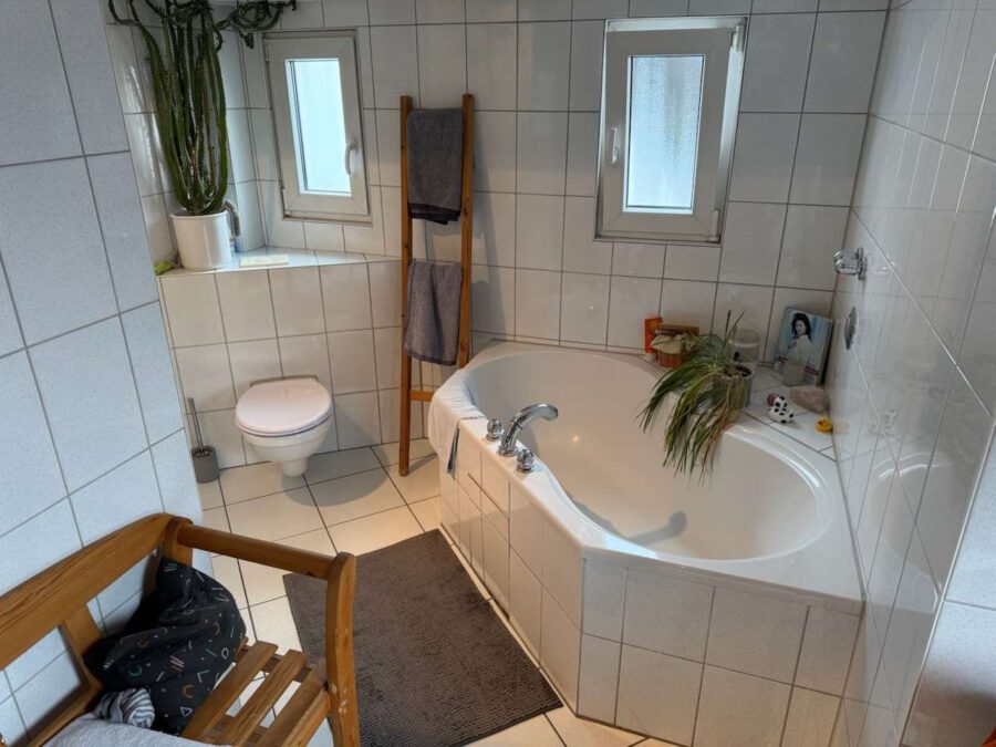 Das Badezimmer verfügt über Badewanne, Dusche und Waschbecken; eine bodentiefe Dusche ließe sich bei Bedarf problemlos nachrüsten. Ein separates WC befindet sich neben der Küche und ist vom Flur aus zugänglich.