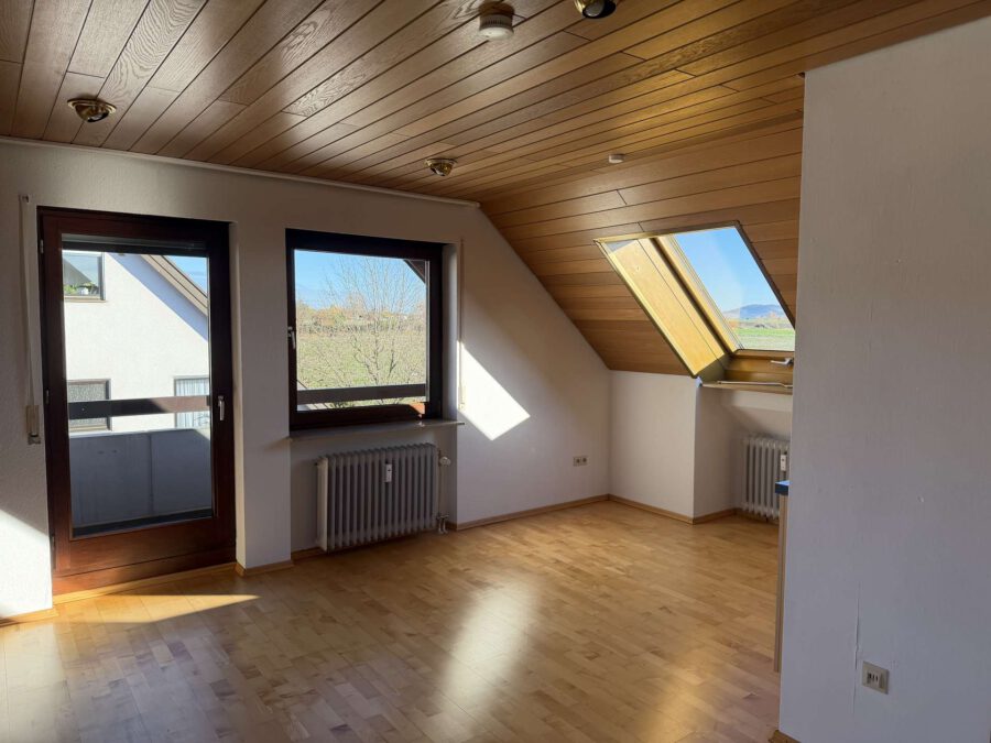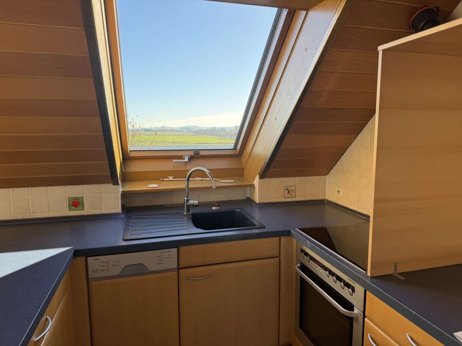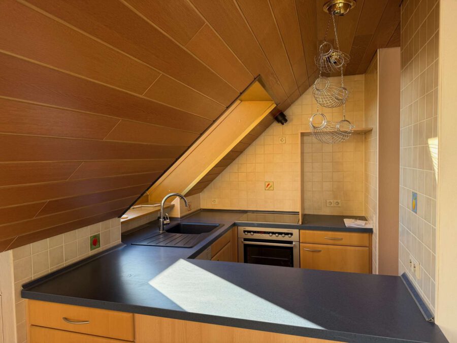 Am Ende des Flurs öffnet sich der helle und großzügige Wohn- und Essbereich mit integrierter Küche. Dank der Dachfenster und des angrenzenden Balkons wirkt der Raum besonders freundlich und lichtdurchflutet. Die Einbauküche umfasst eine Spülmaschine, einen Herd, einen Backofen sowie reichlich Stauraum.