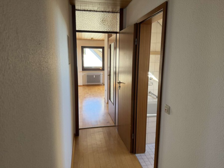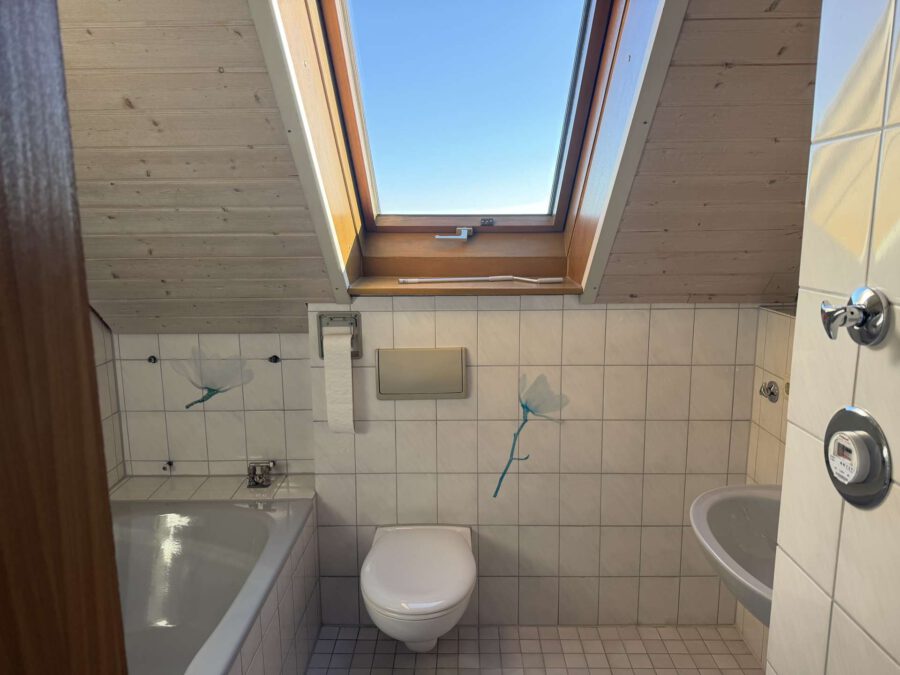 Rechts vom Flur befindet sich das Badezimmer, ausgestattet mit Badewanne, WC, Waschtisch, Waschmaschinenanschluss sowie einem Dachfenster, das für natürliches Licht und gute Belüftung sorgt.