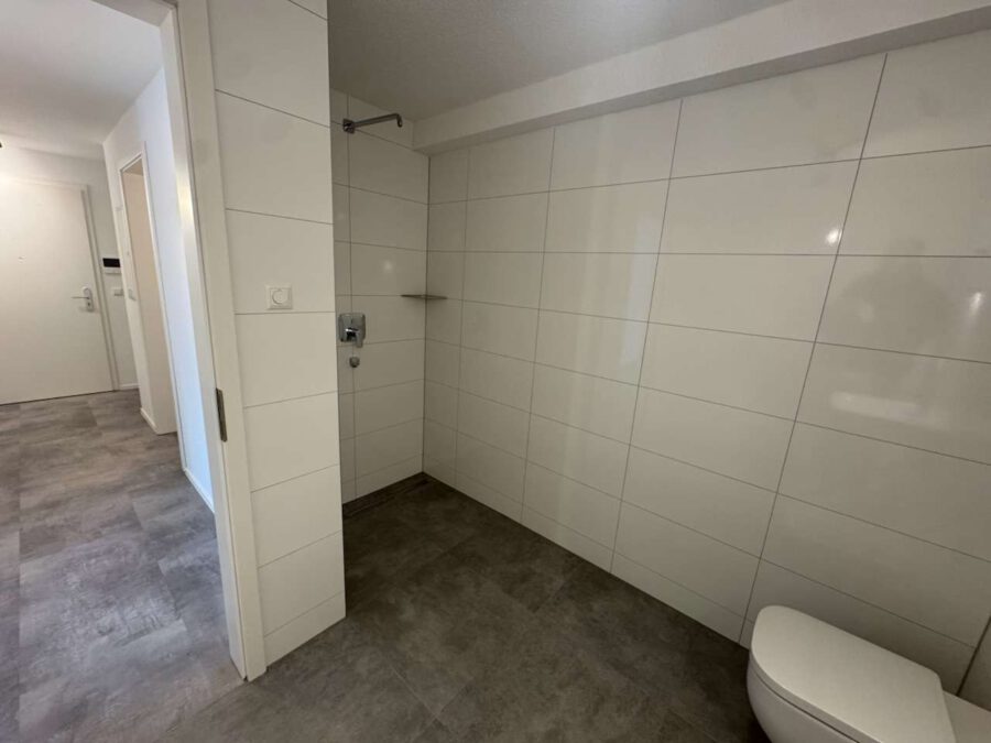 Das Badezimmer verfügt über eine bodentiefe Dusche (auf Wunsch mit Glastrennwand), ein modernes WC und einen Waschtisch. Zusätzlich steht ein separates Gäste-WC zur Verfügung, das vom Flur aus zugänglich ist.