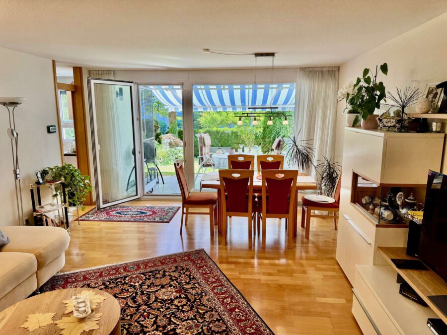 Zentrales Element der Wohnung ist der großzügige Wohn-Essbereich mit Zugang zur Küche sowie den sonnenverwöhnten Garten mit überdachter Terrasse. Das bodentiefe Fenster über die gesamte Raumbreite sorgt für eine sehr gute Belichtung.