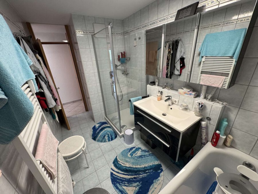 Das Kinderzimmer verfügt ebenfalls über ein bodentiefes Fenster und bietet auf 11,2 qm ausreichend Platz für ein Bett, einen Schrank sowie einen Schreibtisch. Direkt daneben liegt das Elternschlafzimmer mit Platz für ein großes Bett sowie einen Kleiderschrank und eine Kommode. Am Ende des Flurs befindet sich das 2019 modernisierte Badezimmer mit einer Badewanne, einer Dusche und einem Waschtisch mit Spiegelschrank.