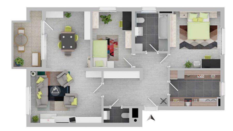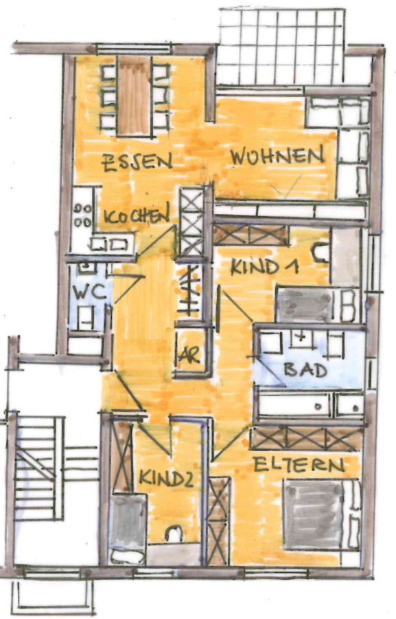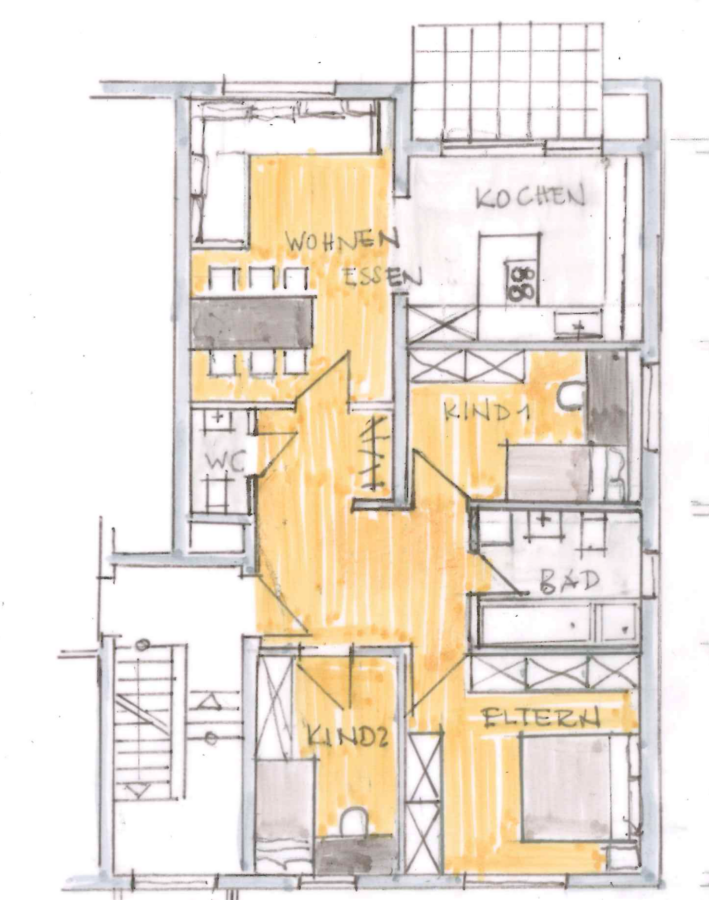 In der Bildergallerie finden Sie zwei Grundriss-Varianten, die mit kleineren Umbaumaßnahmen, aus der Wohnung Platz für 3 Schlafzimmer schaffen könnten.