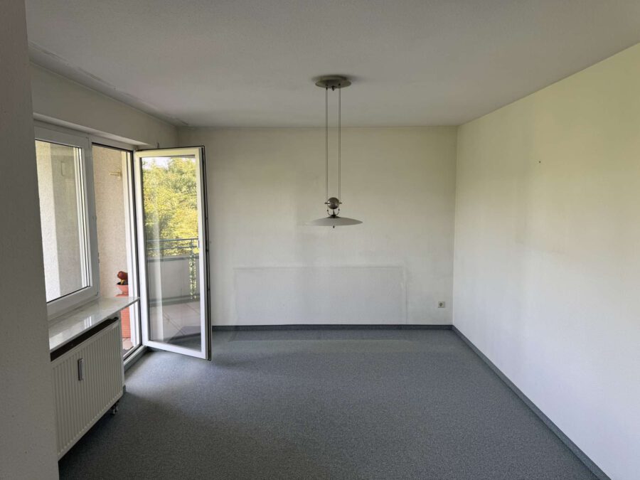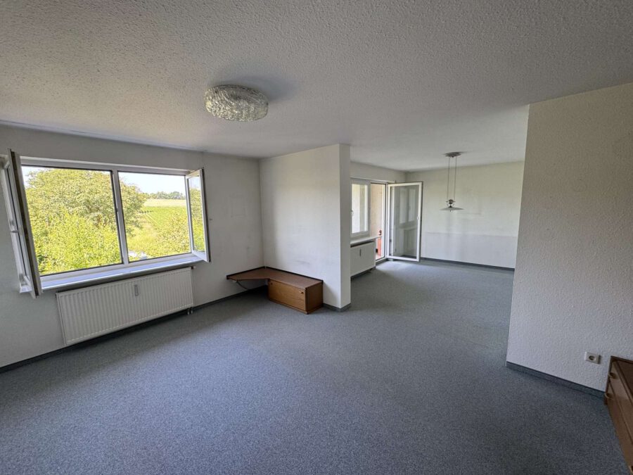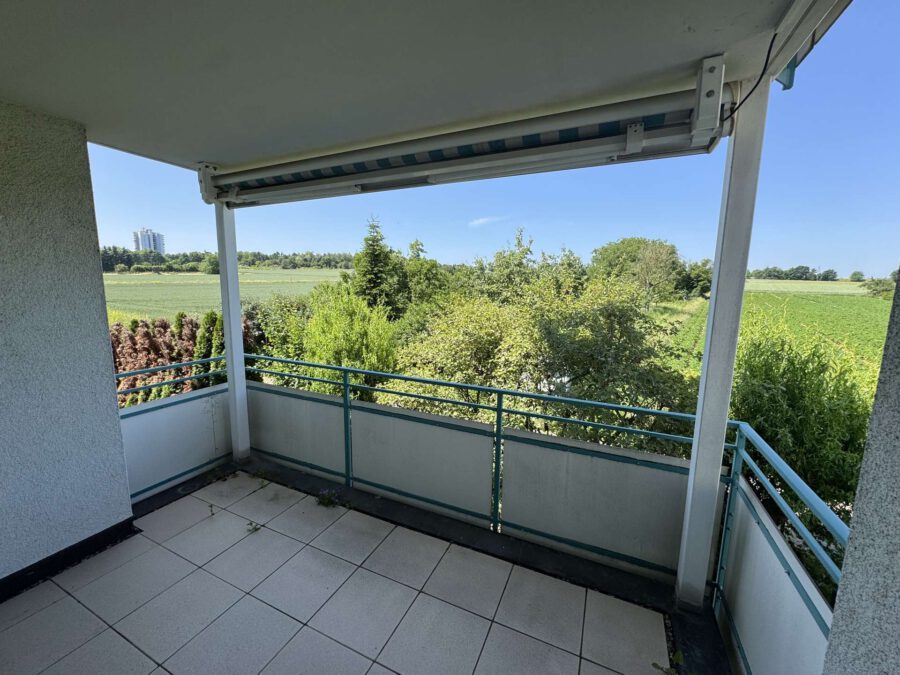 Auf der Westseite der Wohnung liegt der offene und lichtdurchflutete Wohn- und Essbereich, der durch große Fensterflächen sowie den Zugang zum überdachten Balkon mit Markise und Stromanschluss beeindruckt. Der unverbaute Weitblick über die Felder Richtung Westen verleiht diesem Raum eine ganz besondere Atmosphäre – ideal zum Abschalten, Entspannen oder Gäste empfangen.