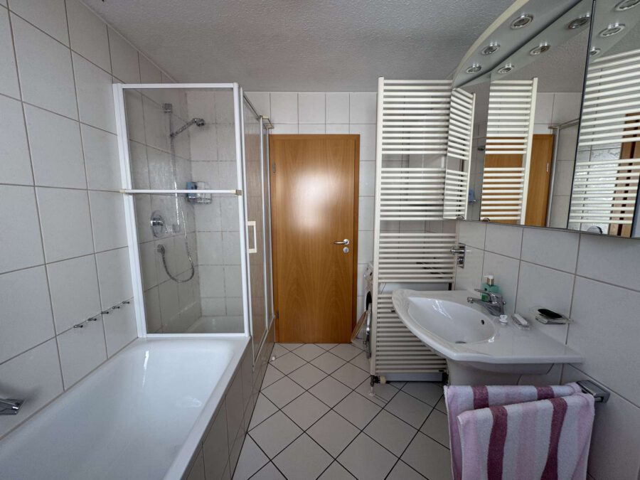 Das Badezimmer mit Tageslicht ist mit Dusche, Badewanne, WC und Waschbecken mit Spiegelschrank ausgestattet – Waschmaschinenanschluss und Steckdose für den Trockner sind ebenfalls vorhanden.