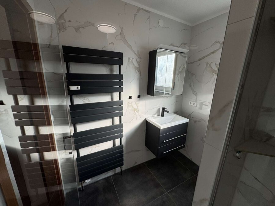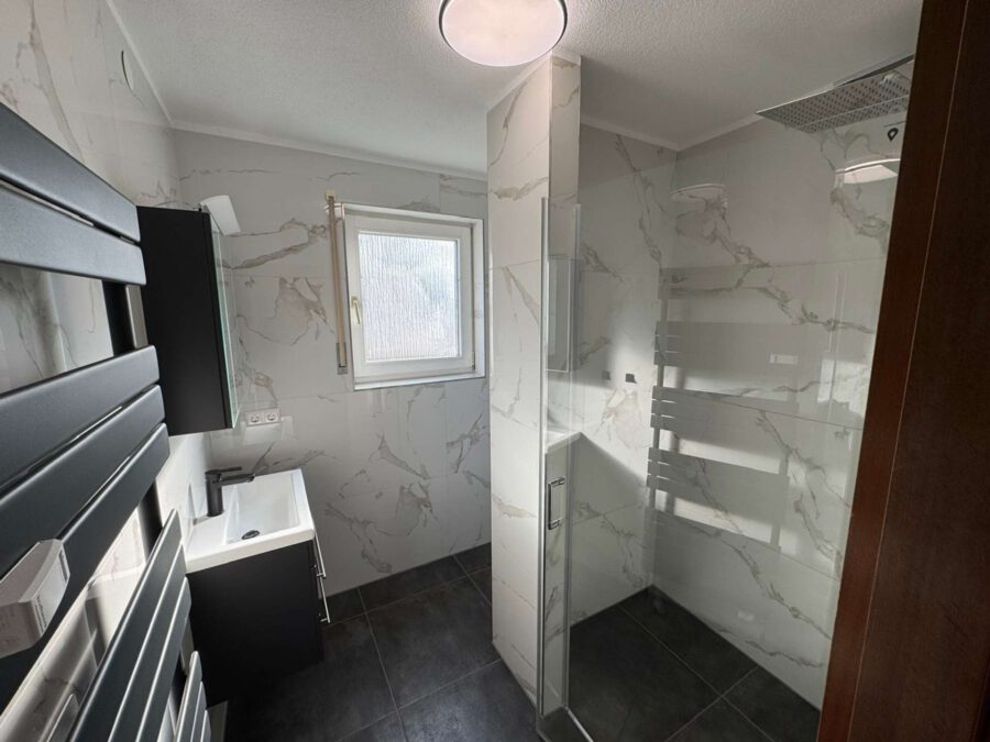 Das Badezimmer mit Tageslicht wurde im 2021 umfassend saniert und mit einer bodenebenen Dusche, inklusive Glastrennwand und Rainshower sowie einem Spiegelschrank und Waschbecken mit Unterschrank ausgestattet. Im Badezimmer befindet sich des Weiteren, geschickt hinter der Dusche versteckt, ein Platz für die Waschmaschine