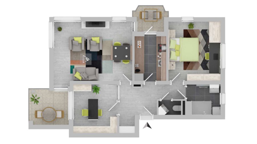 Der offene Wohn-Essbereich besticht ebenfalls durch eine große Fensterfront sowie einem Ausgang auf den zweiten (überdachten) Balkon.