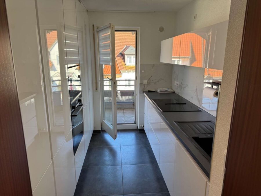 Gegenüber des Eingangsbereichs befindet sich die großzügige Küche mit eigenem Balkon. Die Küche wurde 2021 komplett erneuert und besticht durch hochwertige Einbaugeräte von Bosch sowie einer modernen Arbeitsplatte und hochwertigen Fliesen.