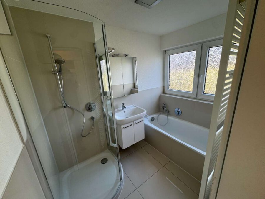 - Badezimmer mit Dusche, Badewanne sowie Spiegel- und Unterschrank