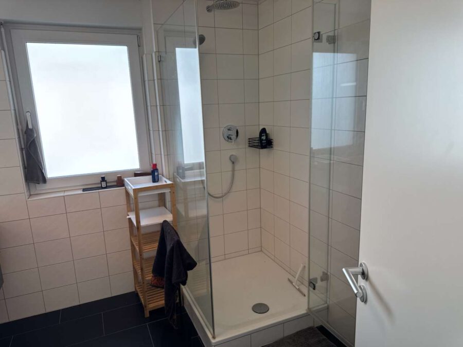Das Tageslicht-Badezimmer verfügt über eine komfortable Steppdusche, einen Waschtisch sowie einen Spiegelschrank mit Unterschrank.